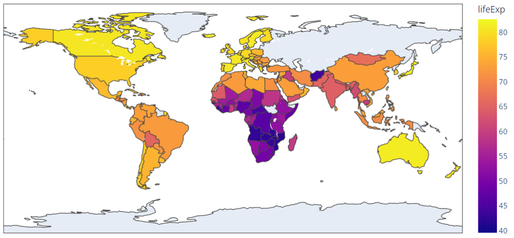 | color="lifeExp", # lifeExp est une colonne de df. Elle représente l'espérance de vie. | |