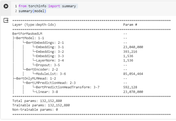 Avant de compter par nous-mêmes le nombre de paramètres de ce modèle BERT, utilisons un outil à disposition pour compter à notre place cette quantité et qui nous servira de référence.