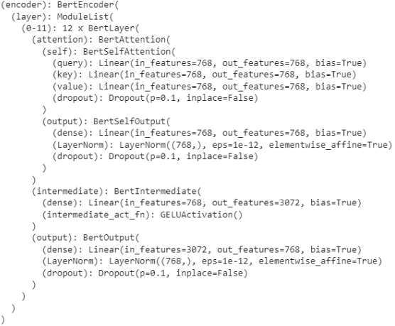 EncoderLe gros des troupes se situe dans l’encodeur. On note qu’il y a 12 modules BertLayer qui ont tous la même architecture. Ainsi, pour compter le nombre de paramères de l’encodeur, on comptera les paramères dans chaque BertLayer et on multipliera à la fin par 12.