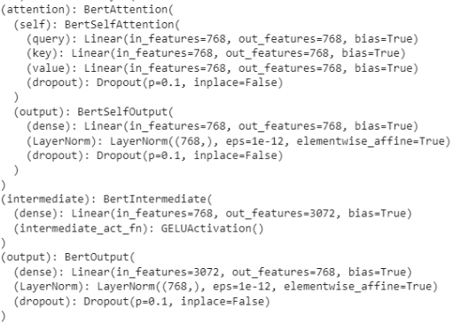 BertLayerDans une BertLayer, on note qu’il y a tout d’abord trois couches Linear.