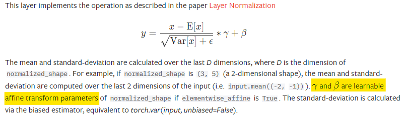 Ainsi, les couches LayerNorm de ce modèle ont chacune deux paramètres pour chaque sortie qu’elles ont. En effet, la documentation de Pytorch indique la chose suivante :